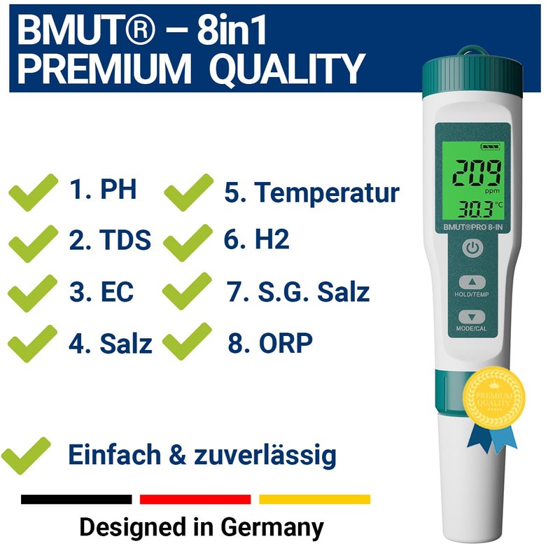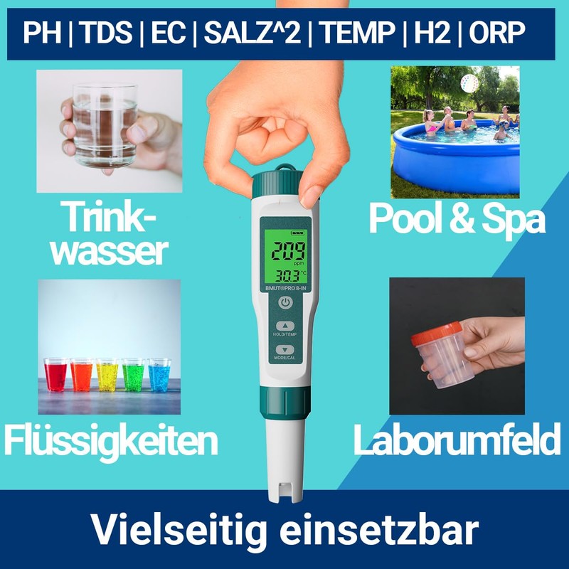 - ✔ [8-IN-1 MEASURER FOR PRECISION TESTS] Measures pH, TDS (dissolved solids), EC (electrical conductivity), salinity (in % and ppm), temperature, H2 (hydrogen ion concentration) and ORP (oxidation reduction potential) - all in one device for accurate and versatile results. Ideal for anyone who needs comprehensive fluid analysis.