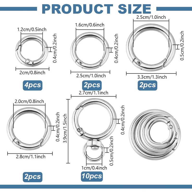- 5 Sizes: Our swivel snap hook about 27mm wide, 39mm/1.53" long, 4mm thick, hole: 10x5mm; Spring gate rings have 4 sizes, 4pcs rings about 20mm/ 0.78" in diameter; 6pcs rings about (24.5/ 27.5/ 33mm) / (0.96/ 1.08/ 1.3 inch). Smooth with large inward-opening clasp