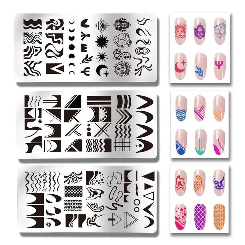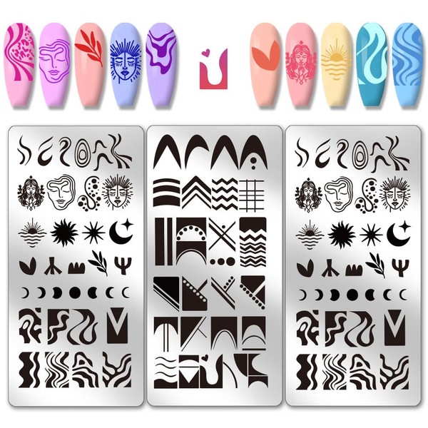 PH PandaHall 3pcs French Tip Nail Stamping Plates Geometric Line Nail Art Stencils Boho Styles Manicure Art Templates Moon Sun Patterns Nails Design Stencil for Women Manicures Salon Printing Supplies