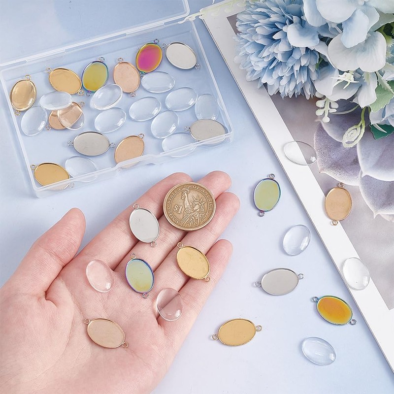 PH PandaHall 40Pcs 304 Stainless Steel Oval Bezel Pendant Trays 20Pcs 4 Colors Pendant Blanks Settings, 20pcs 18x13mm Glass Cabochons Dome for Wedding Graduation Photo Charm Jewellery Making