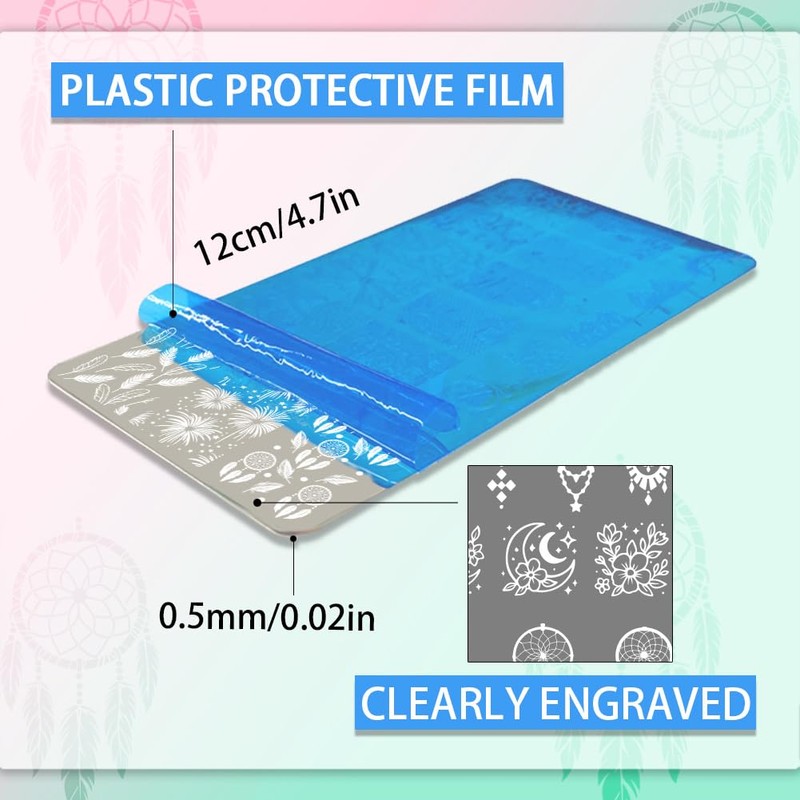 PH PandaHall Nail Stamping Plate Kit with Silicone Nail Stamper, 5pcs Fantasy Feather Dreamcatcher Art Templates Nail Art Stencils Stainless Steel Image Plates with Scraper Tool for Manicures Salon