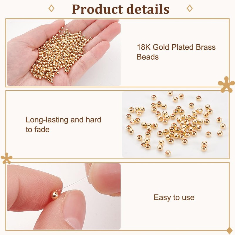 PH PandaHall Pack of 600 18K Gold Beads, 3 mm Beads for Making Bracelets, Seamless, Smooth Beads, Durable Waist Beads, Metal Beads for Multilayer Bracelets, Satellites