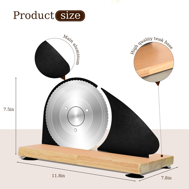 - Real material: Classic Hand Crank Home Bread Slicer is a perfect tool made of 11.8 inches in length and 7.8 inches in width of high-quality teak for the base and 7.5 inches in height of aluminum alloy for the main body. It is also equipped with a 304 stainless steel corrugated blade. Sharp and harmless to the hands