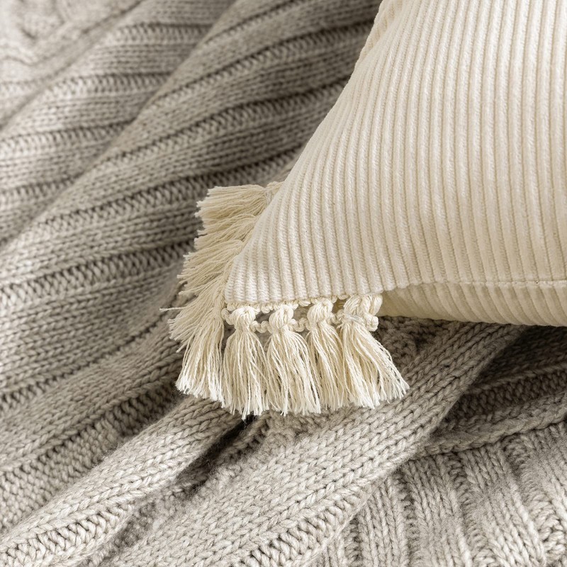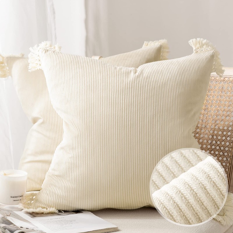 Phantoscope Pack of 2 Corduroy Pillow Covers Decorative Striped Velvet Throw Pillows with Cotton Tassels Soft Cushion Covers Pillowcases, Off White 20 x 20 Inches