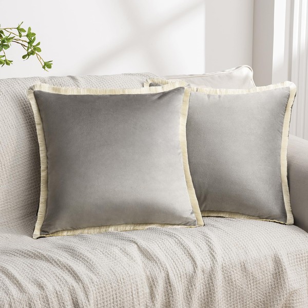 Phantoscope Pack of 2 Velvet Decorative Throw Pillow Covers, Double-Sided Tassel Trimmed Design, Soft Luxury Velvet Pillows Square Cushion Case for Couch Sofa Bed, Grey, 18 x 18 inches 45 x 45 cm