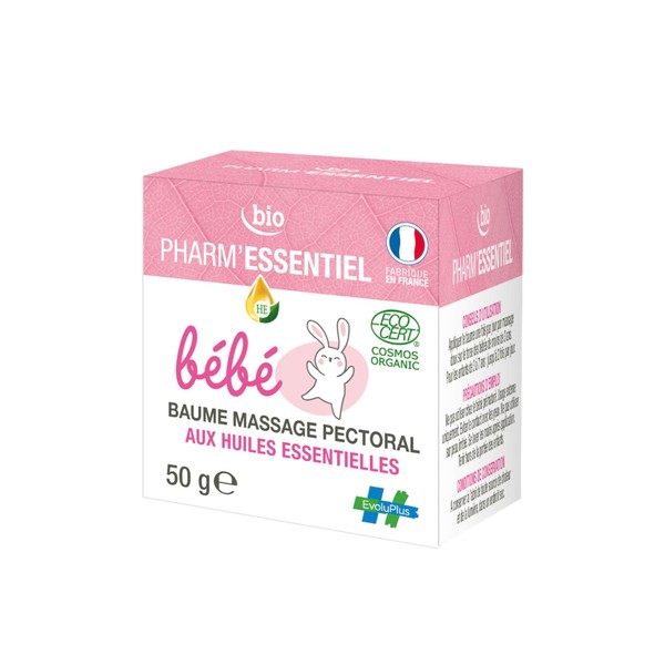 Pharm'Essentiel organic breast balm is a natural and soothing care for gentle breast massage in babies from 5 kg. The formula with organic essential oils of Palmarosa, Thyme Linalool, Ravintsara and Siberian fir supports breathing and brings relief during cold periods.