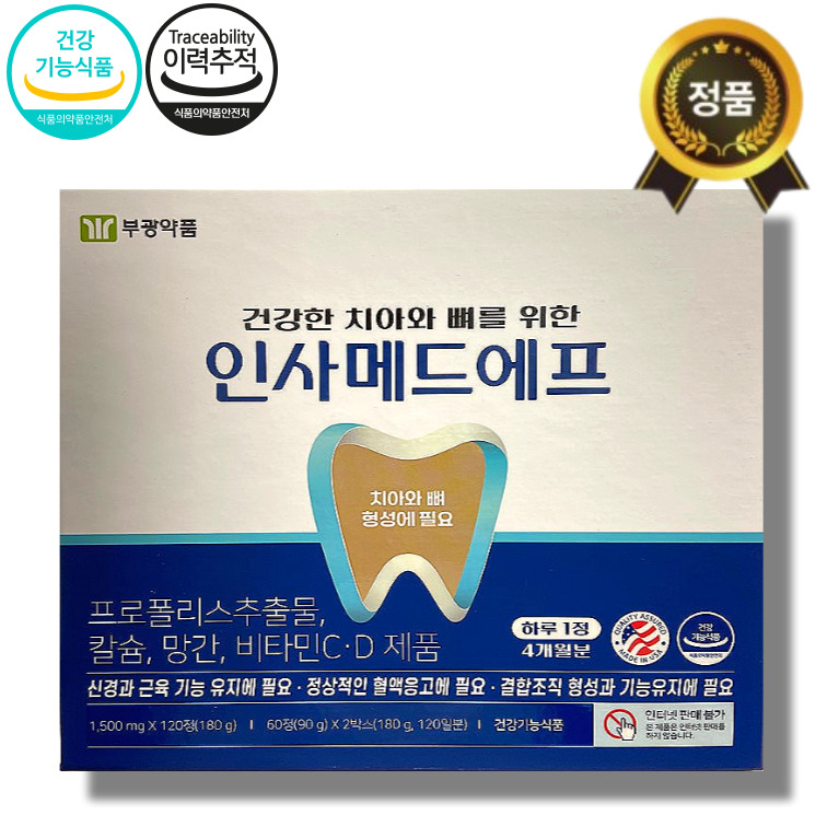 부광인사메드 에프(건강기능식품)ㅣ1500mg x 60정 x 2박스 (총 120정)ㅣ1일 1회 1정- 프로폴리스추출물- 칼슘뼈아 치아형성에 필요,신경과 근육기능 유지에 필요,정상적인 혈액응고에 필요,발생 위험감소에 도움을줄 수 있음- 비타민C결합조직 형성과 기능유지에 필요,철의 흡수에 필요- 비타민D뼈의 형성과 유지에 필요,칼슘과 인이 흡수되고 이용되는데 필요,발생 위험감소에 도움을줄 수 있음- 망간뼈 형성에 필요,에너지 이용에 필요,유해산소로부터 세포를 보호하는데 필요- 아연정상적인 면역기능에 필요,정상적인 세포분열에 필요- 셀레늄(셀렌)유해산소로부터 세포를 보호하는데 필요대한민국 식품의 안전처가 인정한건강기능식품의 원료!