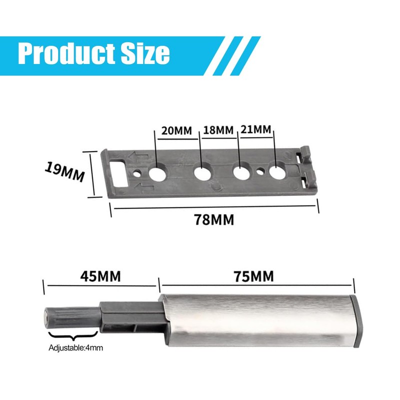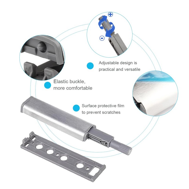 Door opener: PHCOZY magnetic catch has a smooth and attractive stainless steel housing. High quality ABS base and spring loaded core. Rust and corrosion resistant, more durable and longer lasting. Thicker porous base for greater toughness and durability. The magnetic tip can be adjusted 1-4mm to adjust to the tightness of the door, so you don't have to worry about the exact positioning of the installation if it should be difficult.