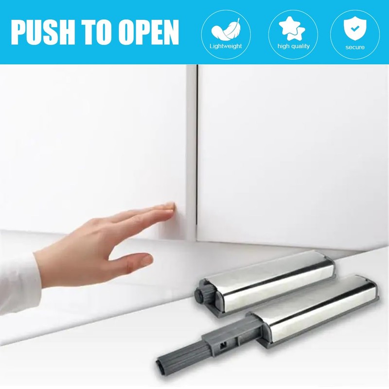 Push to open: PHCOZY push to open door opener. The built-in spring-loaded plunger system provides a strong tension to create a quick pop-open effect when you press on the door. It allows for a design where doors or drawers can be opened effortlessly without the need for handles or knobs. Creates a clean, seamless look without handles. Suitable for kitchen cabinets, drawers, cupboards, wardrobes and dressing tables.