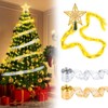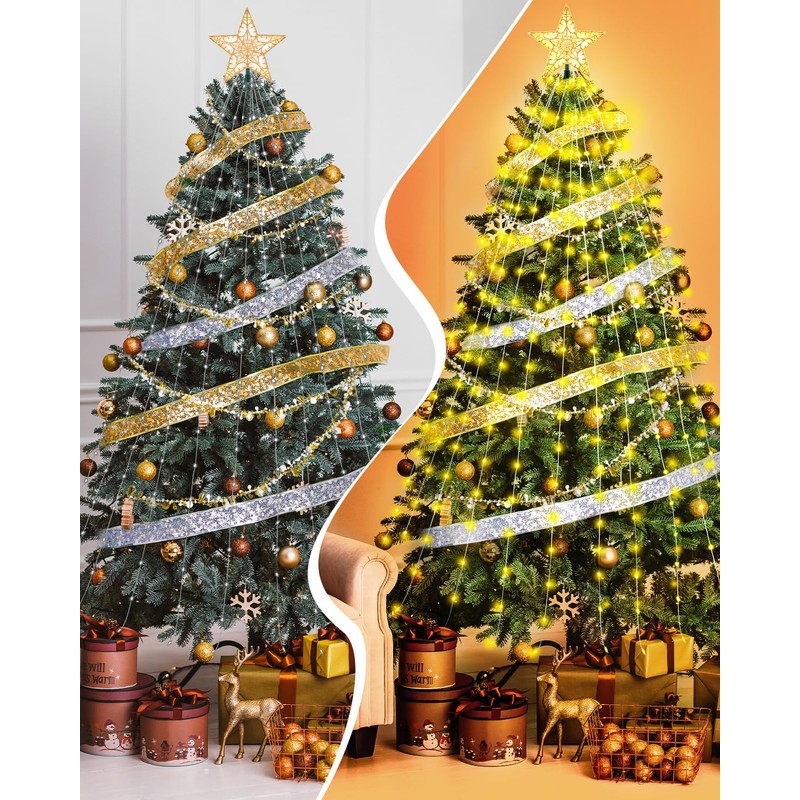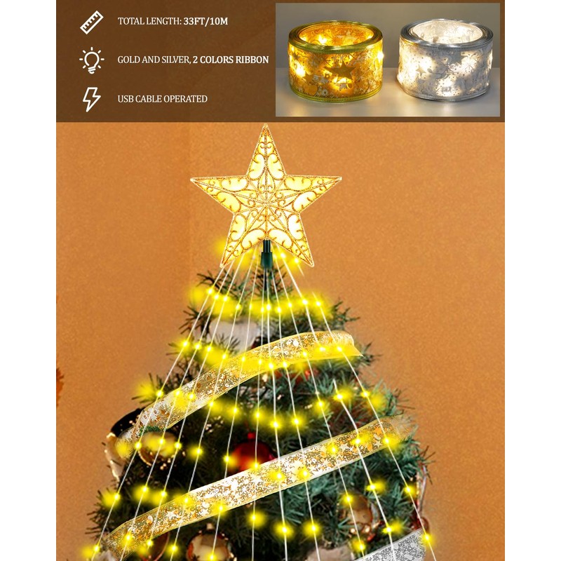 • [ALL-IN-ONE PACKAGE] Our Christmas tree topper lighted set includes everything you need to effortlessly transform your room into a holiday wonderland. The package includes: Christmas star tree topper x1, Tree Ribbon Lights x2, Christmas Clear Iridescent and Gold Bead Garland x2. Designed for easy and creative Christmas tree decoration.