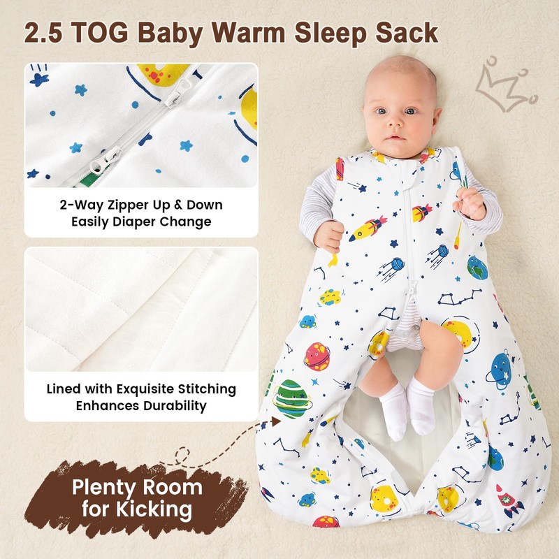 PHF 100% Cotton Baby Sleep Sack 2.5 TOG, 12-18 Months Baby Wearable Blanket With 2-Way Zipper, Winter Infant Sleeping Sack for Baby Boys, Warm Comfy Quilted Sleeping Bags, Large Size, Space