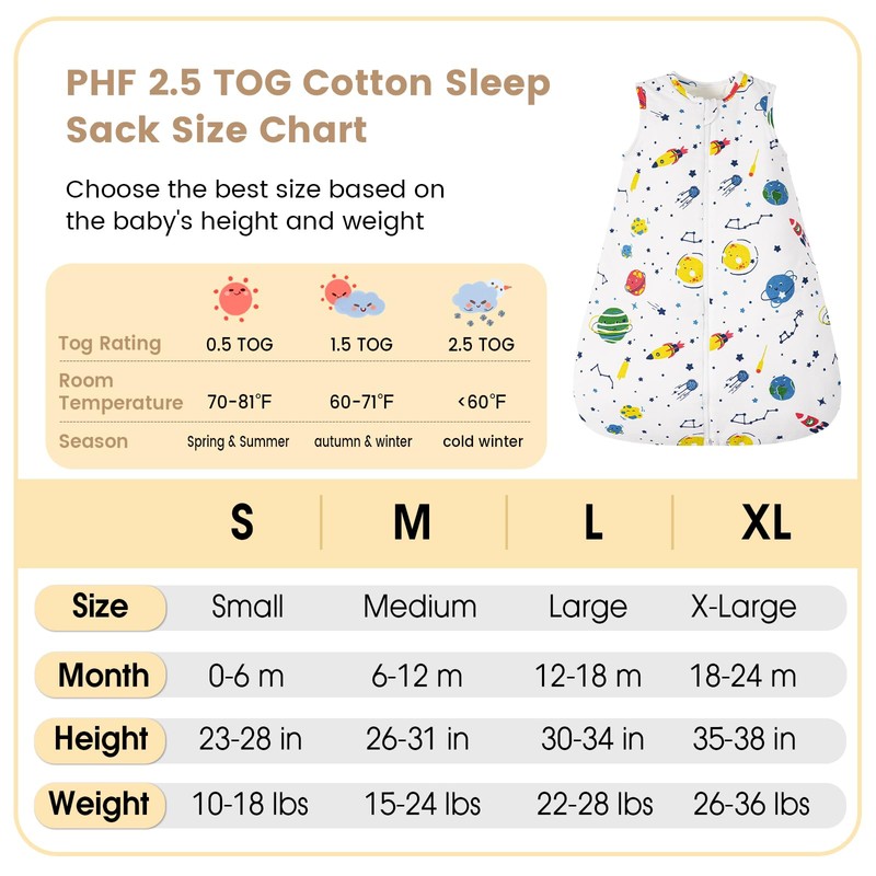 - Warm and Cozy: PHF baby sleep sack adopts unique 3-layer design. The 100% cotton fabric inside and outside, which is very soft and cozy, making it very friendly to baby's sensitive skin. The fluffy high-quality polyester filling is super soft and breathable, warm and comfortable. Our 2.5 TOG sleeping bags ensure warmth and comfort while also providing breathability, creating the perfect sleeping environment for your baby especially in winter.