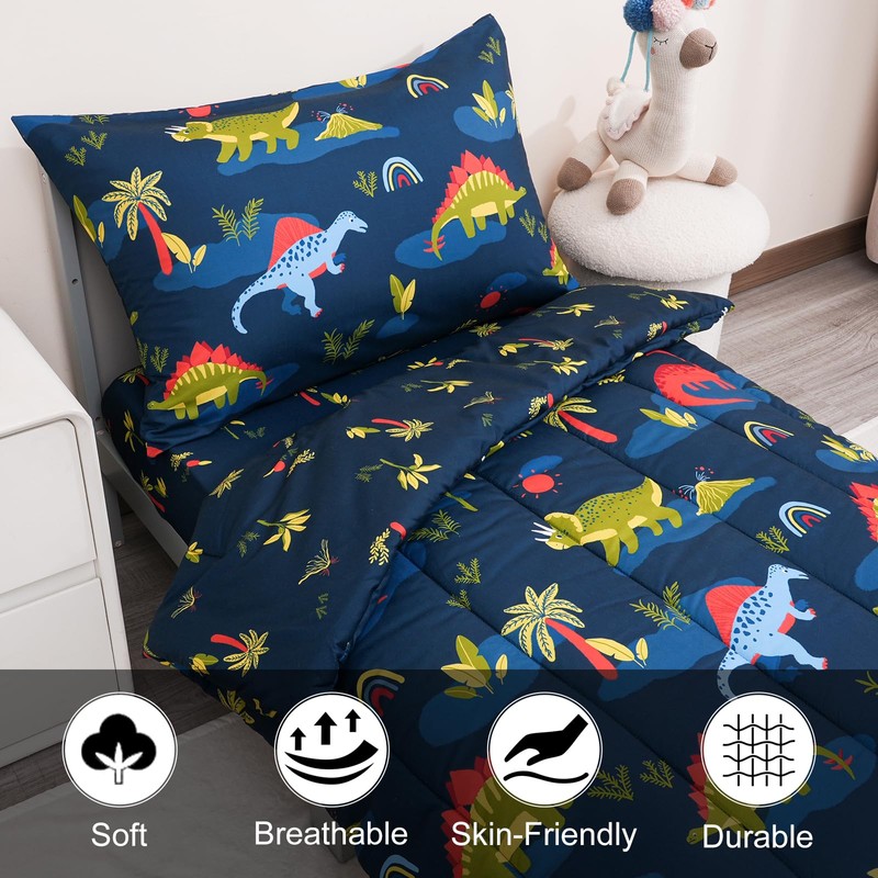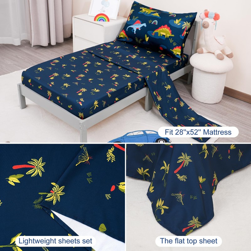 - Our toddler bedding set includes 1 space toddler comforter (42" x 57"), 1 fitted Sheet (28" x 52" + 8"), 1 flat top sheet (45" x 60"), 1 standard dinosaur pillowcases (20" x 30"). Our sets provide everything you need for a perfectly coordinated baby bed, saving you time and effort. Experience the ultimate in bedding convenience with PHF toddler bedding sets.