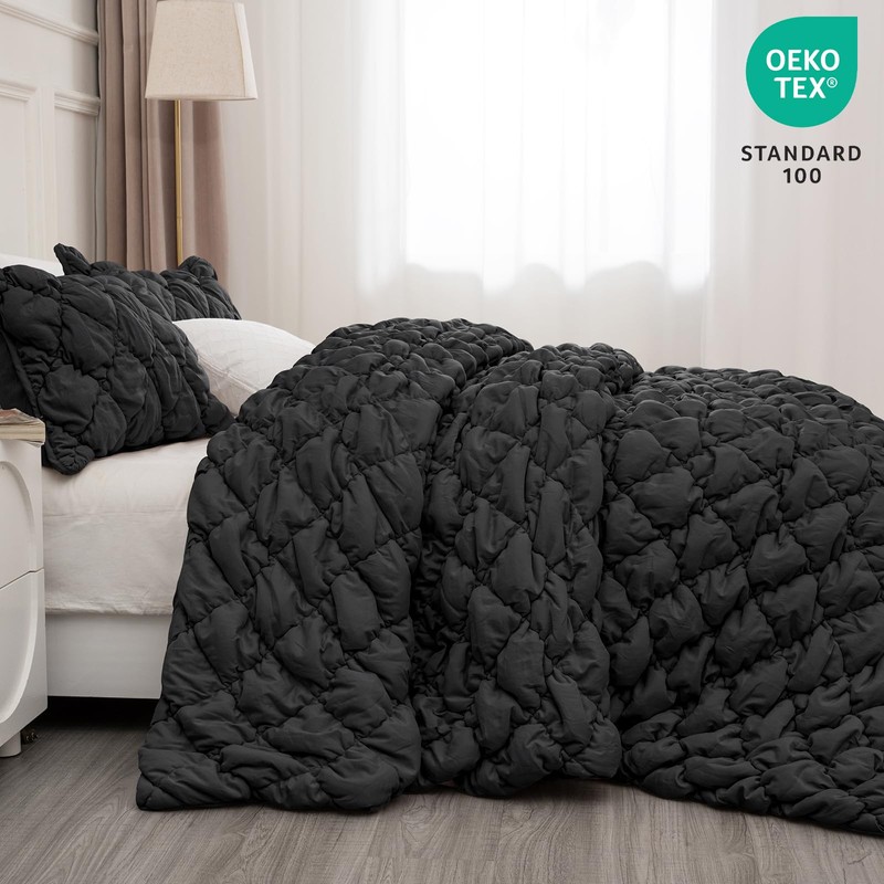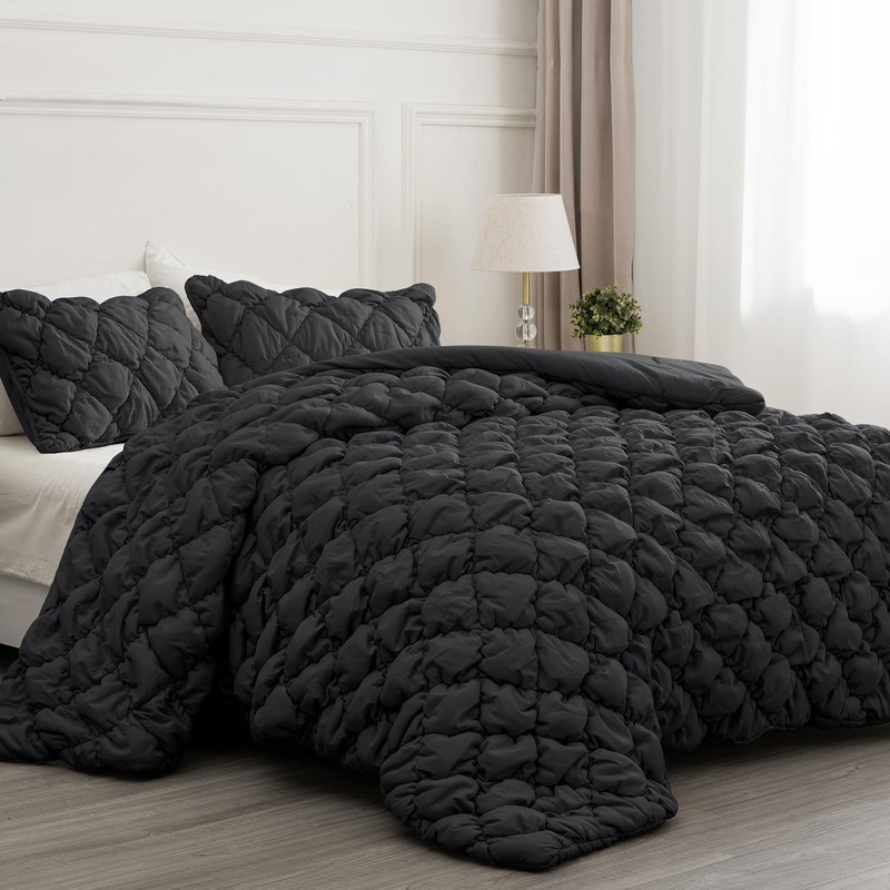 PHF Diamond Marshmallow Puff Comforter Set Queen Size, 3 Pieces Ultra Soft Lightweight Bedding Set for All Season, Pattern Textured 1 Comforter with 2 Pillow Shams, Black