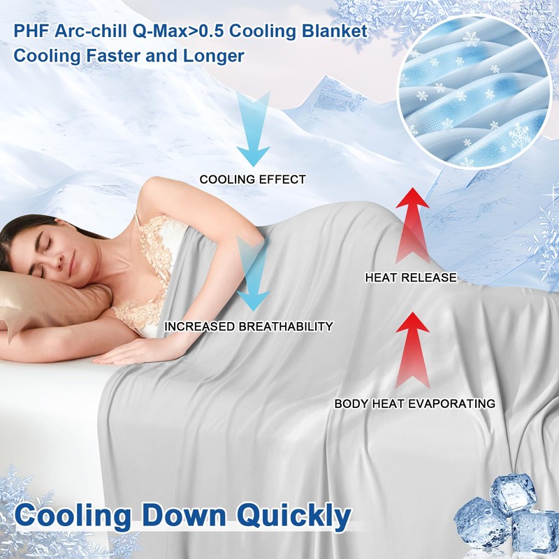 - Double Side Cooling Q-MAX>0.5: Hot sleeper never miss it! Our single layer cooling blanket use Japaness Arc-chill technology, which has a cool-sensing value (Q-max)>0.5, double side cooling, help to release skin heat quickly, effectively inhibit body warming up and keep a balanced temperature between your body and environment, ensure all night dry and cozy. Compared with other products, it provide double side cooling, will cool you down quickly and provide a sweet cozy sweat-free night.
