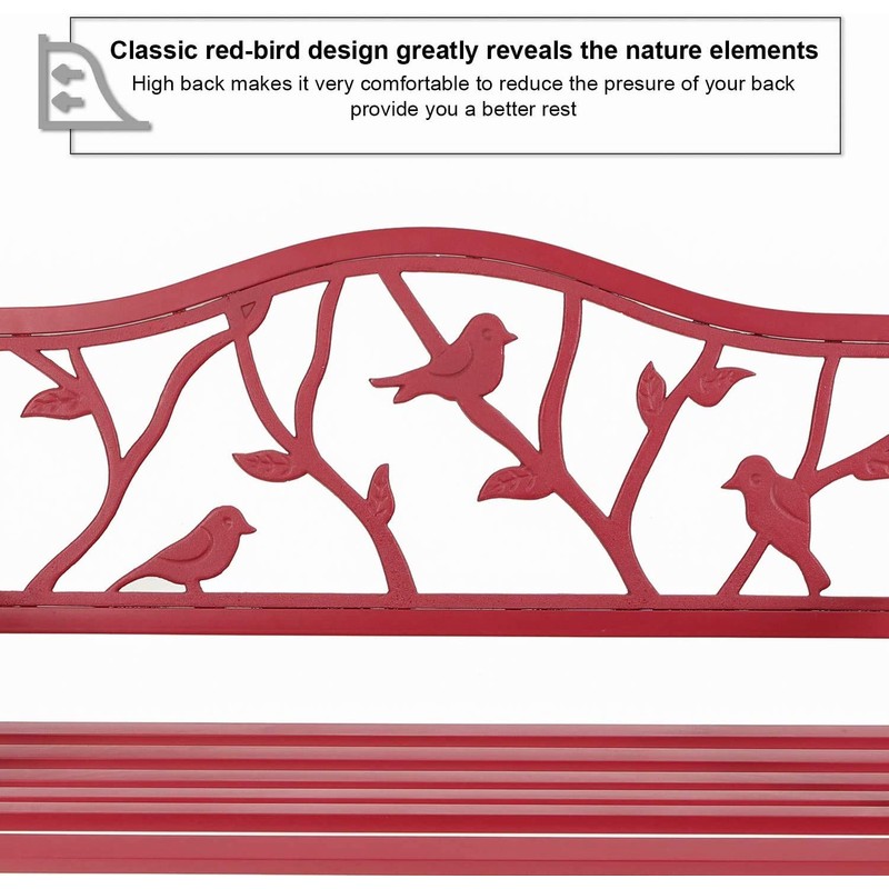 - Red Bird Pattern - Lovely red-bird pattern greatly reveals the nature elements to your backyard, patio, or garden, adds more fun for your kids when play or sit in the yard. Curved-shape armrests make the bench safe from accidentally bumping.