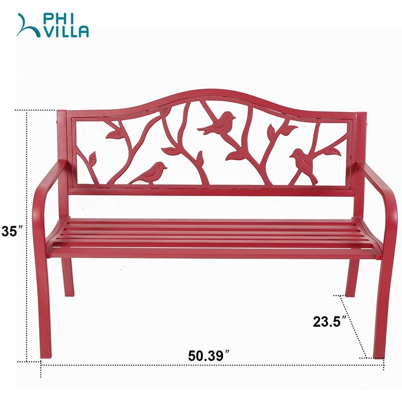 PHI VILLA Red Bird Garden Bench, 50” Metal Outdoor Bench with Backrest and Armrest for Yard, Lawn, Porch, Patio
