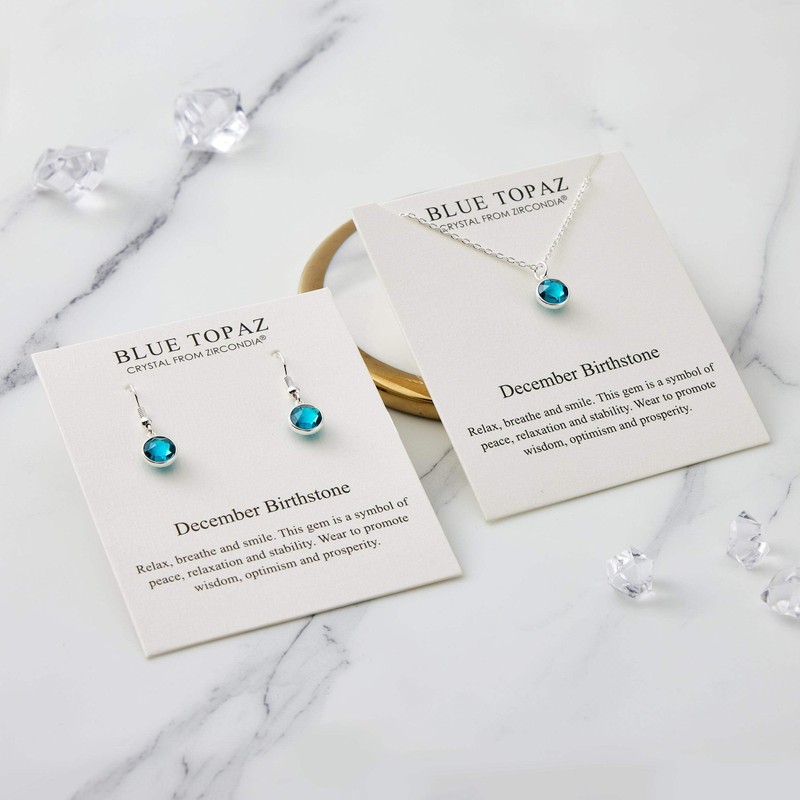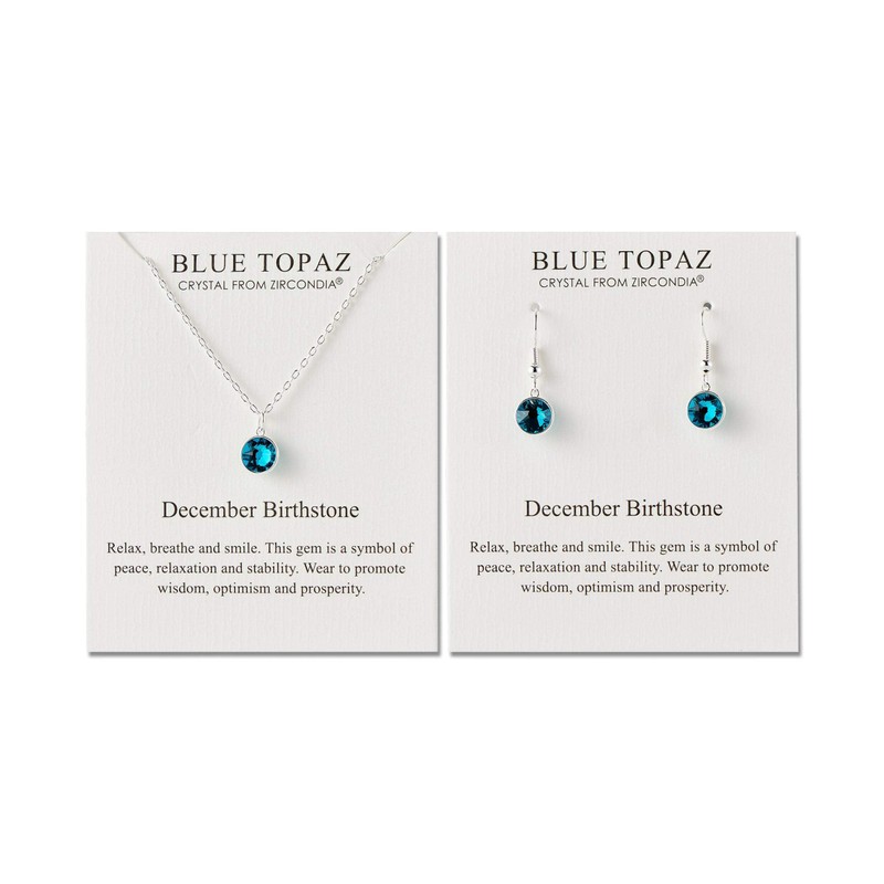 - Made with Trust. December (Blue Topaz) Birthstone Necklace & Drop Earrings Set Created with Zircondia Crystals by Philip Jones. Buy with confidence with our 12-month manufacturer warranty and 30-day money back guarantee if you are not 100% happy with your Set.