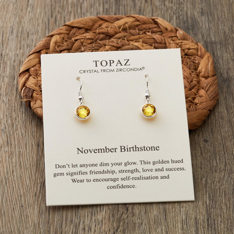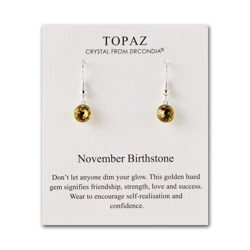 • Made with Trust. November Birthstone Drop Earrings Created with Topaz Zircondia Crystals by Philip Jones. Buy with confidence with our 12-month manufacturer warranty and 30-day money back guarantee if you are not 100% happy with your Earrings.