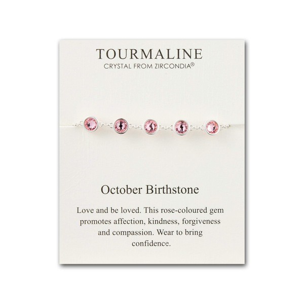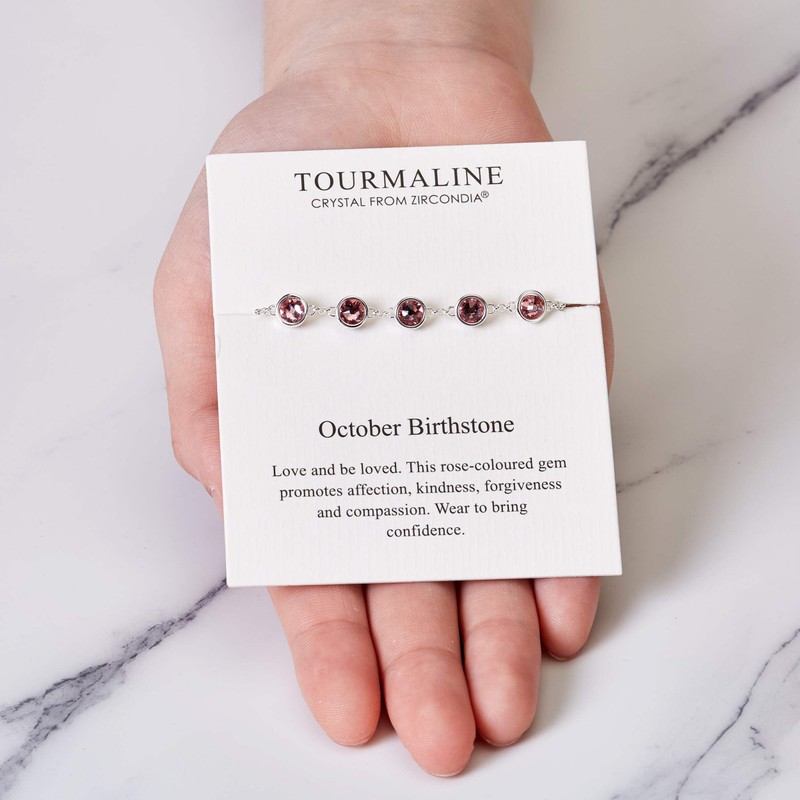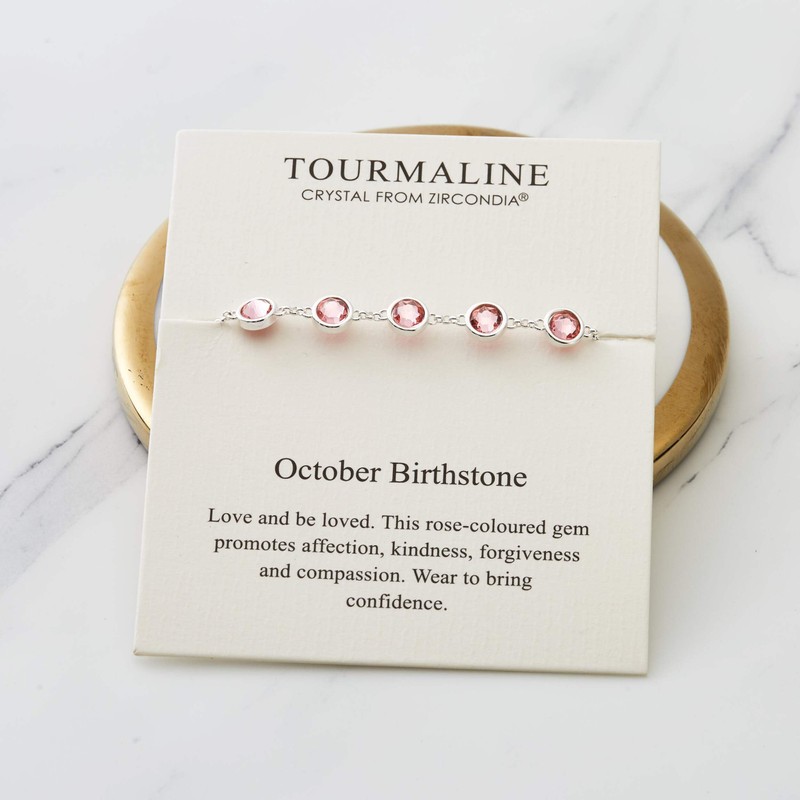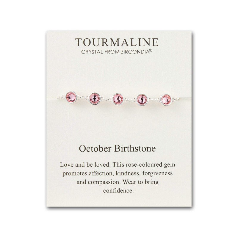 • Made with Trust. October Birthstone Bracelet Created with Tourmaline Zircondia Crystals by Philip Jones. Buy with confidence with our 12-month manufacturer warranty and 30-day money back guarantee if you are not 100% happy with your Bracelet.