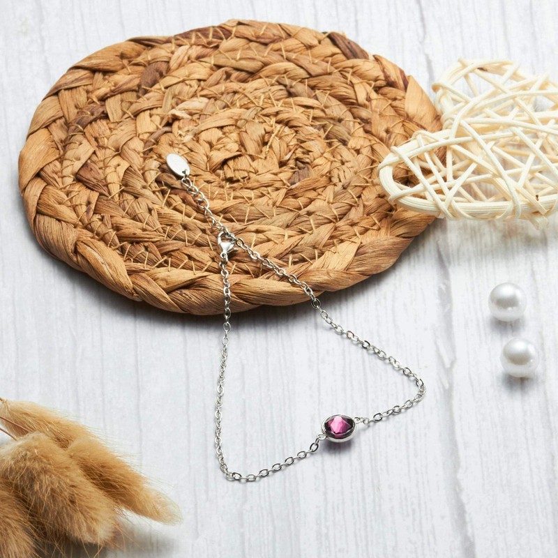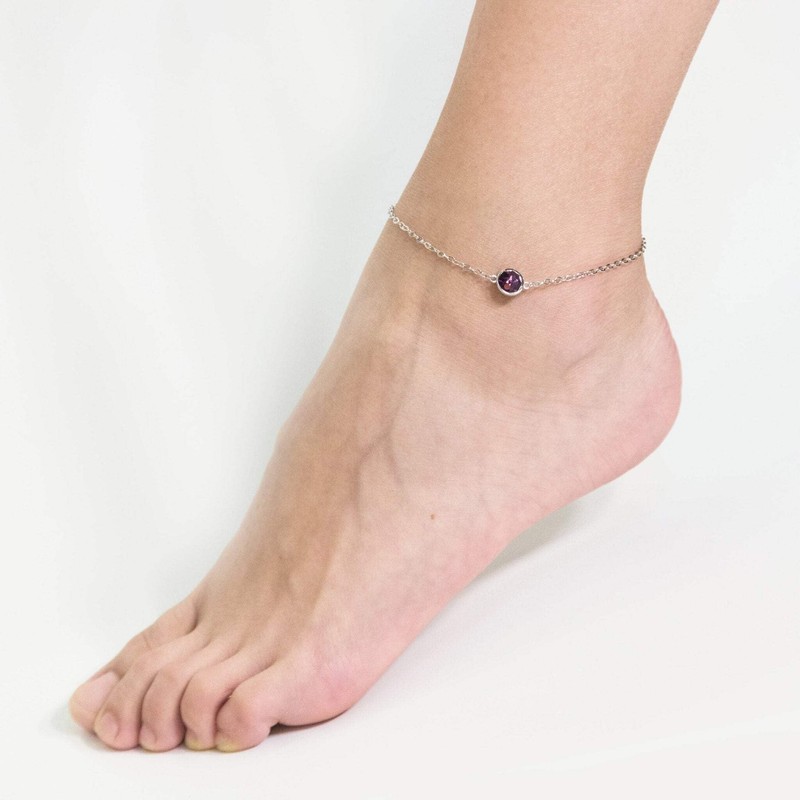 This anklet is plated with silver and made with a brass alloy. It has a charm type and measures 20.3cm with a 3.8cm extender. The chain is a cable type and secured with a lobster claw clasp. It weighs 2.2g and is adorned with one 8mm round crystal from Zircondia in a purple hue.