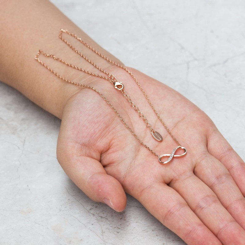 - Made with Trust. Rose Gold Plated Infinity Pendant Necklace Created with Zircondia Crystals by Philip Jones. Buy with confidence with our 12-month manufacturer warranty and 30-day money back guarantee if you are not 100% happy with your Necklace.