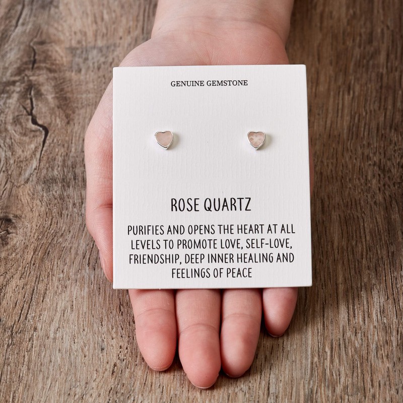 - Made with Trust. Rose Quartz Heart Stud Earrings with Quote Card by Philip Jones. Buy with confidence with our 12-month manufacturer warranty and 30-day money back guarantee if you are not 100% happy with your Earrings.