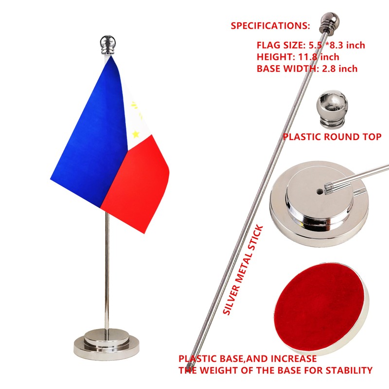 - Speciflcation: the length of the metal flagpole is about 11.8 inches; flag size:8.3" x 5.5"(W xL). the diameter of the base is about 2.8 inches. Quantity: 2 pack Philippines Filipino Miniature Deluxe Table flags.