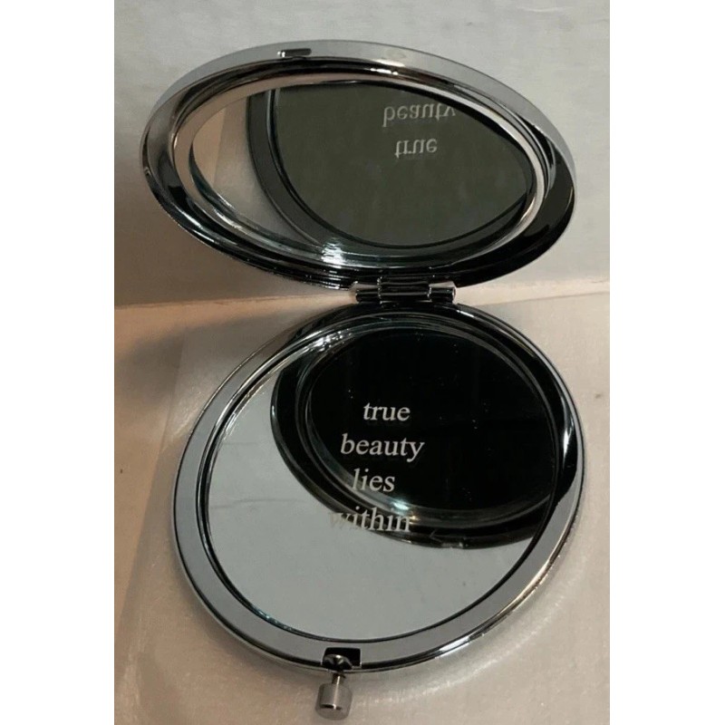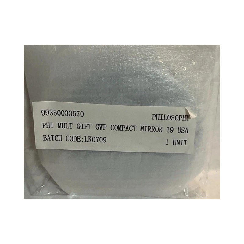 The New In Package Philosophy Compact Mirror is a round, silver polished mirror featuring a dual-sided design. This compact mirror, made by Philosophy, is a sleek and practical accessory for anyone in need of a convenient makeup mirror on-the-go. With a polished silver frame and a compact size of 3” in length and 1/4” in width, this unisex adult product is perfect for touch-ups and quick beauty checks. Made in China, this compact mirror is a stylish and functional addition to any makeup collection.