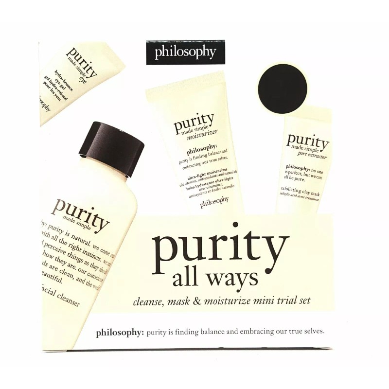 Philosophy Purity All Ways Cleanse, Mask, & Moisturize Mini Trial Set Includes: - Purity Made Simple One-Step Facial Cleanser, 3 fl. oz. - Purity Made Simple Ultra-Light Moisturizer, 0.5 fl. oz. - Purity Made Simple Hydra-Bouce Eye Gel, 0.10 fl. oz. - Purity Made Simple Pore Extractor Purifying Clay Mask, 0.17 fl. oz. |