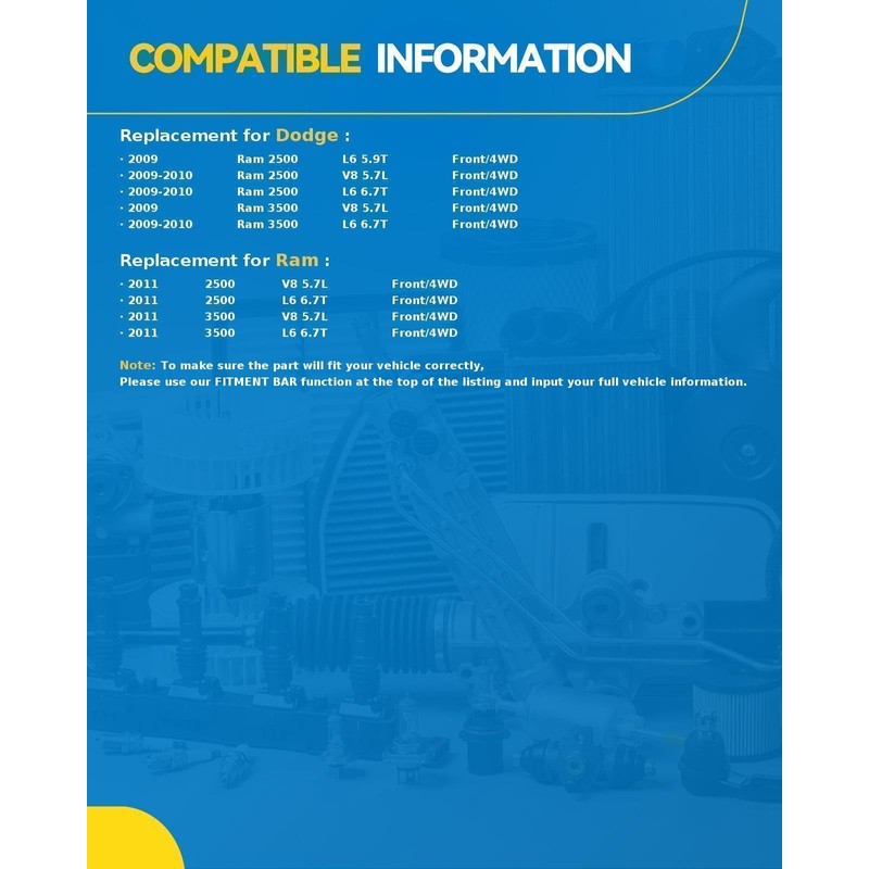 - [Fitment] Front Wheel bearing hub assembly compatible with 2009-2010 Dodge Ram 2500, 2011 Ram 2500, 2011 Ram 3500, 2009-2010 Dodge Ram 3500