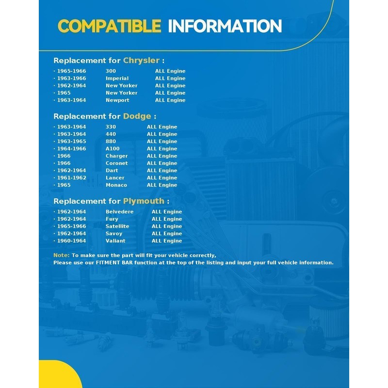 - [Vehicle Fitment]: PHILTOP Brake Master Cylinder Compatible with Plymouth Valiant 1960-1964, Dodge Coronet 1966, Chrysler 300 1965-1966, Plymouth Satellite 1965-1966, Dodge Lancer 1961-1962, Dodge Monaco 1965, Dodge Charger 1966, Dodge A100 1964-1966, Chrysler Imperial 1963-1966, Plymouth Savoy 1962-1964, Chrysler New Yorker 1962-1965, Dodge 440 1963-1964, Chrysler Newport 1963-1964, Plymouth Fury 1962-1964, Plymouth Belvedere 1962-1964, Dodge Dart 1962-1964, Dodge 330 1963-1964, Dodge 880 1963-1965.