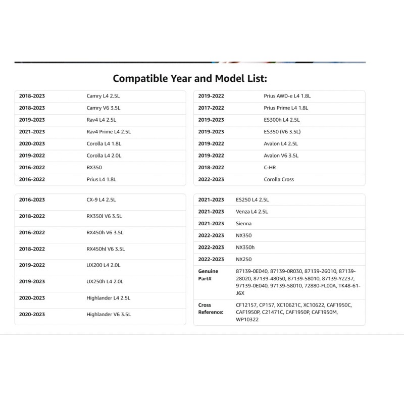 - Compatible Auto List: Replacement for, RAV4(2019-2021), Camry(2018-2021), Corolla(2019-2022), RX350(2016-2021), Prius(2016-2021), ES350(2019-2021), Avalon(2019-2021), CX-9(2016-2021), ES300h(2019-2021), RX450h(2016-2021), Highlander(2020-2021), UX200(2019-2021), UX250h(2019-2021), etc