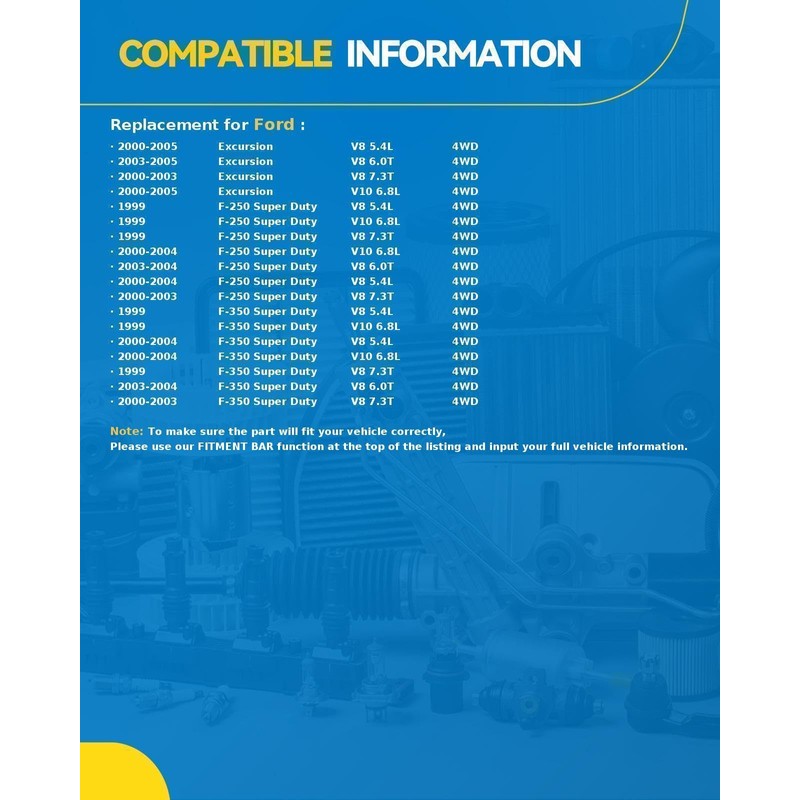 - [Perfect Fitment]: Compatible with Ford 1999-2003 F-250 Super Duty 7.3T, Ford 1999-2003 F-350 Super Duty 7.3T, Ford 1999-2004 F-250 Super Duty 5.4L, Ford 2003-2004 F-250 Super Duty 6.0T, Ford 2003-2004 F-350 Super Duty 6.0T, Ford 1999-2004 F-250 Super Duty 6.8L, Ford 1999-2004 F-350 Super Duty 6.8L, Ford 2000-2005 Excursion 6.8L, Ford 1999-2004 F-350 Super Duty 5.4L, Ford 2000-2003 Excursion 7.3T, Ford 2003-2005 Excursion 6.0T, Ford 2000-2005 Excursion 5.4L. Please enter your vehicle information in the top left corner of listing.