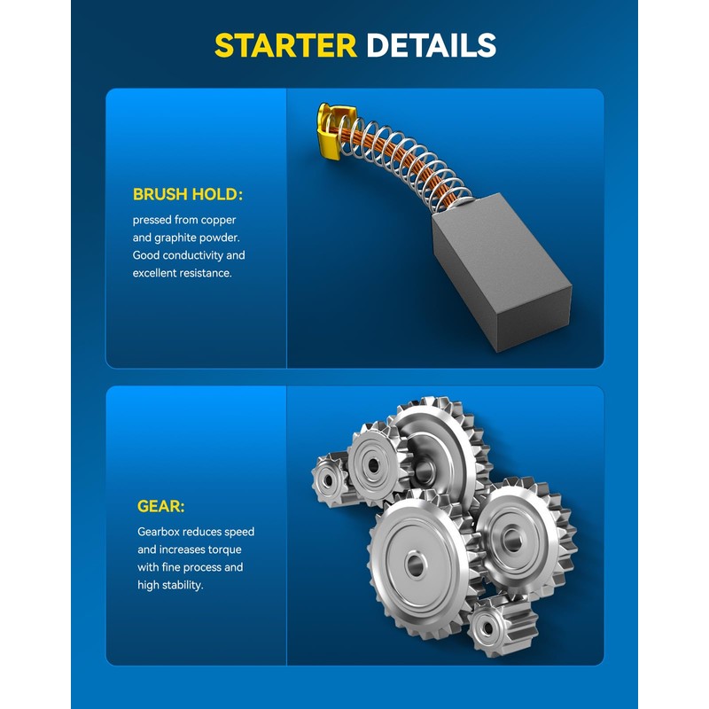 • Efficient QuietCNew Starter with high-quality coils and precision gears enable quick, smooth starts with no noise. Superior conductive materials reduce fuel consumption and prevent short circuits. Install once for lasting performance
