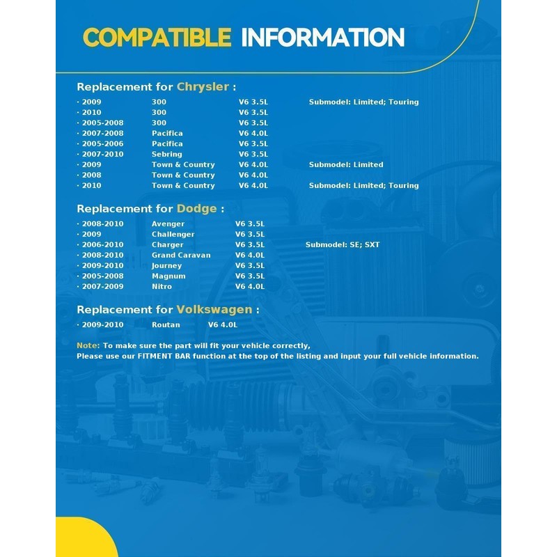 - [Vehicle Fitment]: PHILTOP Timing Belt Kit Compatible with Chrysler Town & Country 2008-2010 4.0L, Pacifica 2005-2006 3.5L, Pacifica 2007-2008 4.0L, 300 2005-2010 3.5L, Sebring 2007-2010 3.5L, Dodge Charger 2006-2010 3.5L, Journey 2009-2010 3.5L, Magnum 2005-2008 3.5L, Challenger 2009 3.5L, Grand Caravan 2008-2010 4.0L, Nitro 2007-2009 4.0L, Avenger 2008-2010 3.5L, fits for Volkswagen Routan 2009-2010 4.0L