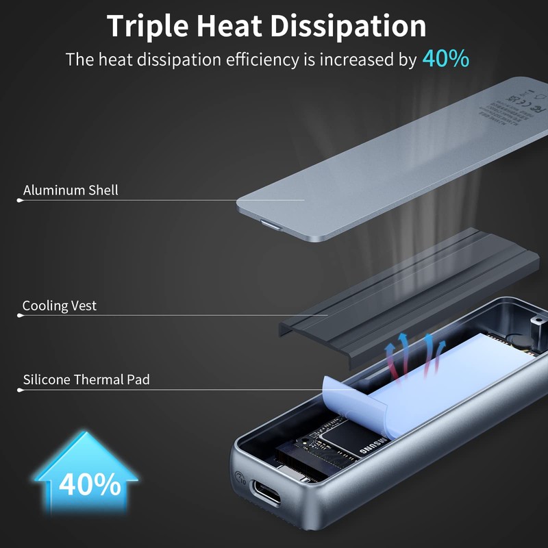 - Triple heat dissipation. The heat dissipation efficiency of the NVME housing is increased by 40%. The sandwich structure of "aluminium housing - cooling vest - silicone thermal pad" is in close contact with M.2 SSD and quickly transfers the heat generated by SSD to the aluminium housing. The groove design on the surface of the M.2 NVMe SSD enclosure effectively increases the heat dissipation surface