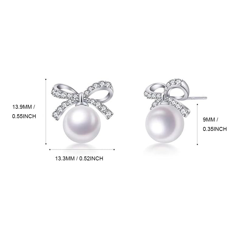 PHNIBIRD Pearl Earrings 925 Sterling Silver Stud Earrings Silver Bow Earrings with 5A Cubic Zirconia Earrings Women's Gifts for Women, Sterling Silver, Cubic Zirconia