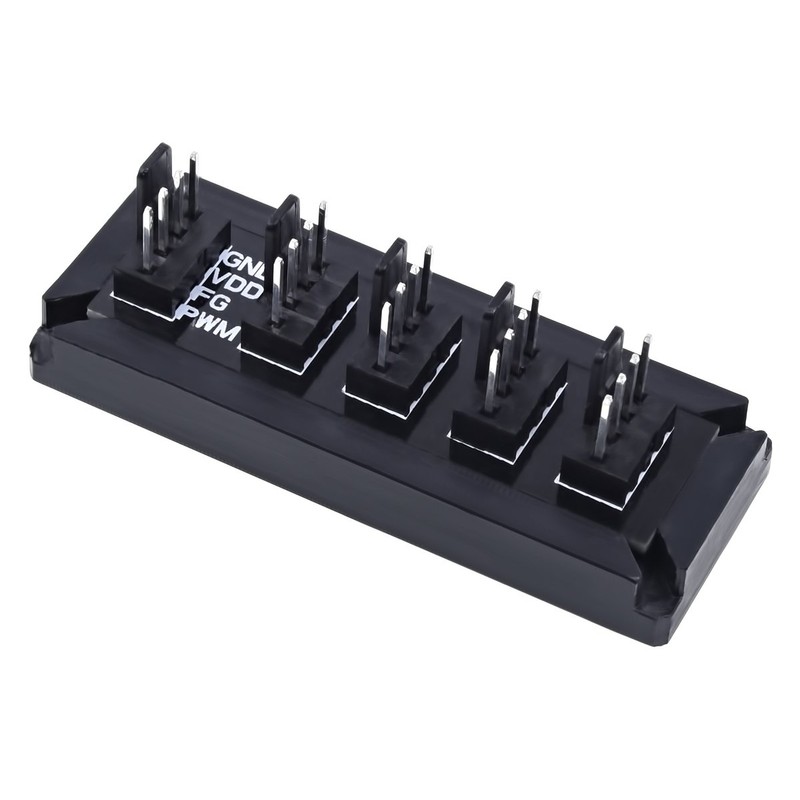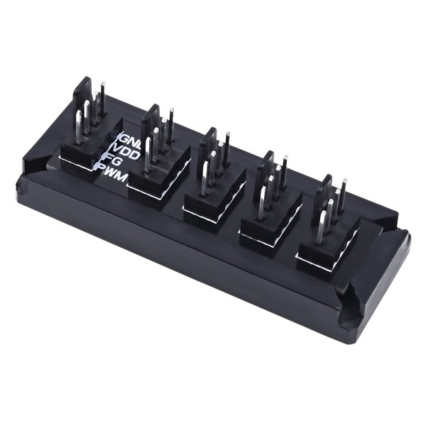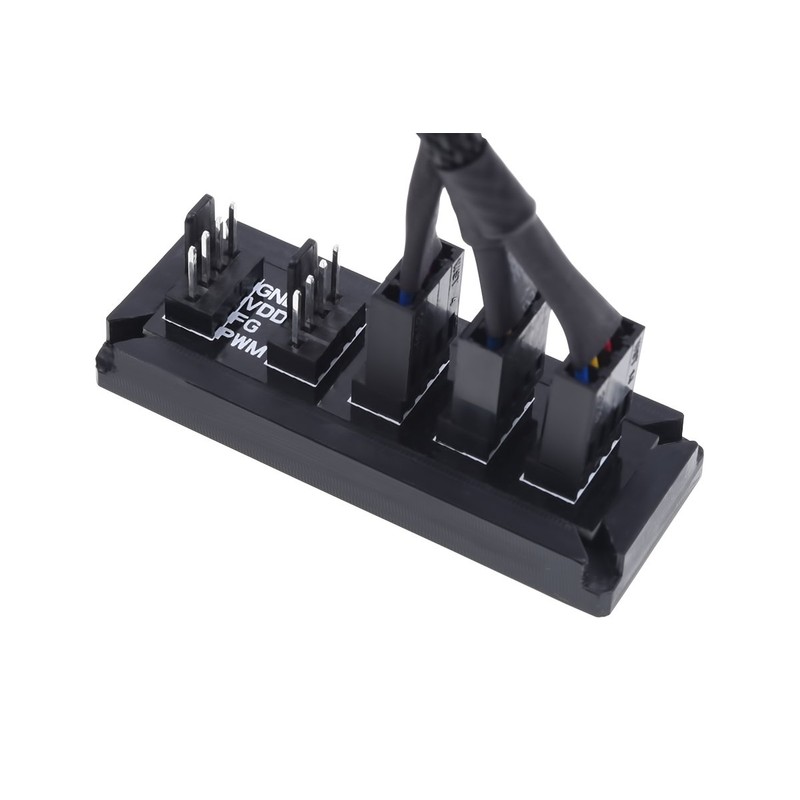 With this PWM splitter from Phobya it is possible to power up to 4 PWM fans at the same time and also transfer the PWM signal of the first fan to all 4 fans. This makes sense, for example, for large radiators. The splitter is very compact and easy to put in the housing. Thanks to the adhesive tape on the back, the board can be attached anywhere in the housing, but optionally also with two screws on the outward holes. Box contents: 1 x board.