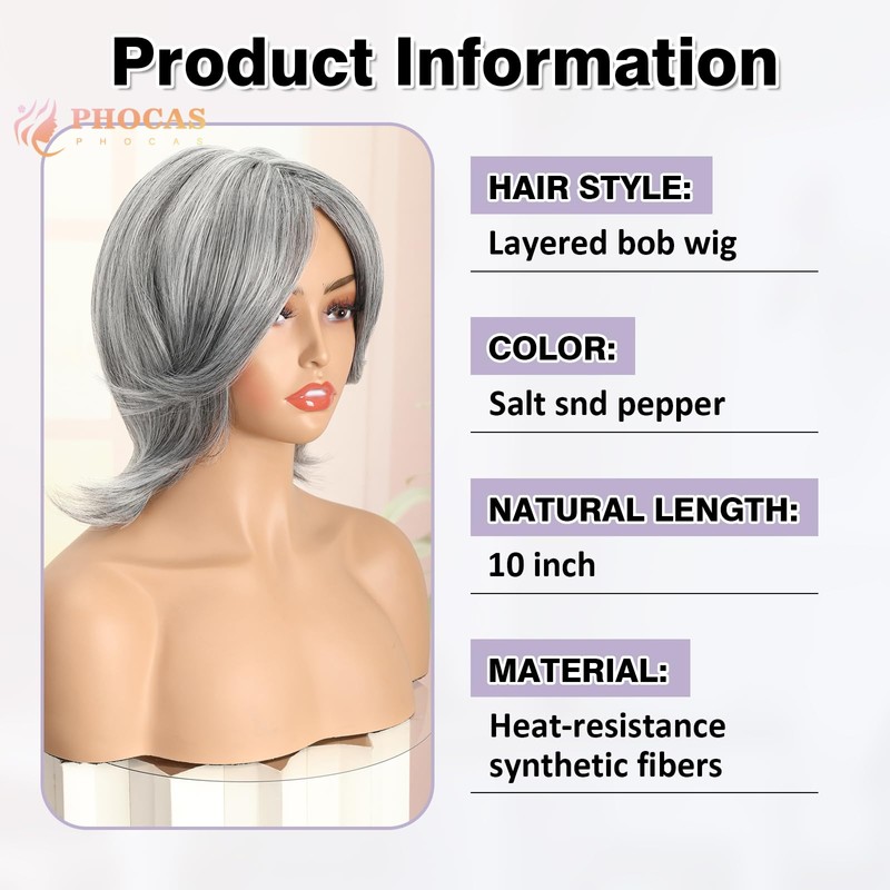 - Natural Fluffy & Layered: This layered bob wig is crafted with a combination of gray and silver highlights, ensuring a sophisticated appearance ideal for women seeking a trendy yet timeless hairstyle.