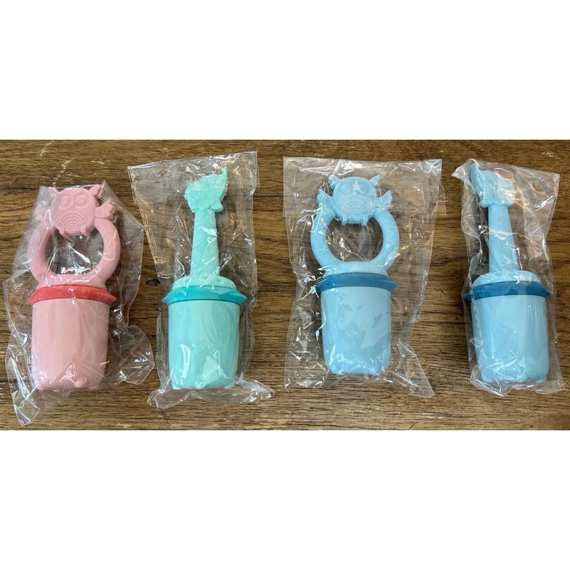 Introducing the 4Pc Phoebe & Wesley Safari Puree Teether, a must-have for your little one! This multiple-piece pacifier set features a flat top nipple made of silicone and comes in assorted colors. Perfect for babies 2 months and older, these pacifiers have a fun owl character family design and are BPA-free.