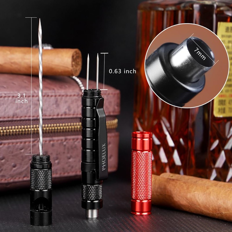 - Excellent design: Cigar punch tool set is made of stainless steel and aluminum with three-section screw switch, light weight, rust resistant, wet chlorine resistant, sharp and hard not easy to break. Each part of the screw can be unscrewed to open the cigar punch,dual nubber and draw enhancer, which can effectively prevent the prevent the hot hand and solve the cigar blockage, so that you can enjoy cigar smoking. The whistle is designed at the tool top for easy use.