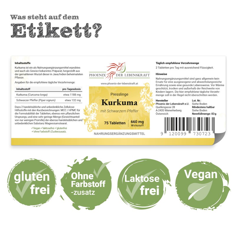 Phoenix der Lebenskraft Kurkuma + Schwarzer Pfeffer Tabletten  660 mg Wirkstoff (Curcuma, Curcumin+Piperin), 75 Tabletten, Premium Qualit?t, Tabletten statt Kapseln, Hergestellt in ?sterreich, Vegan