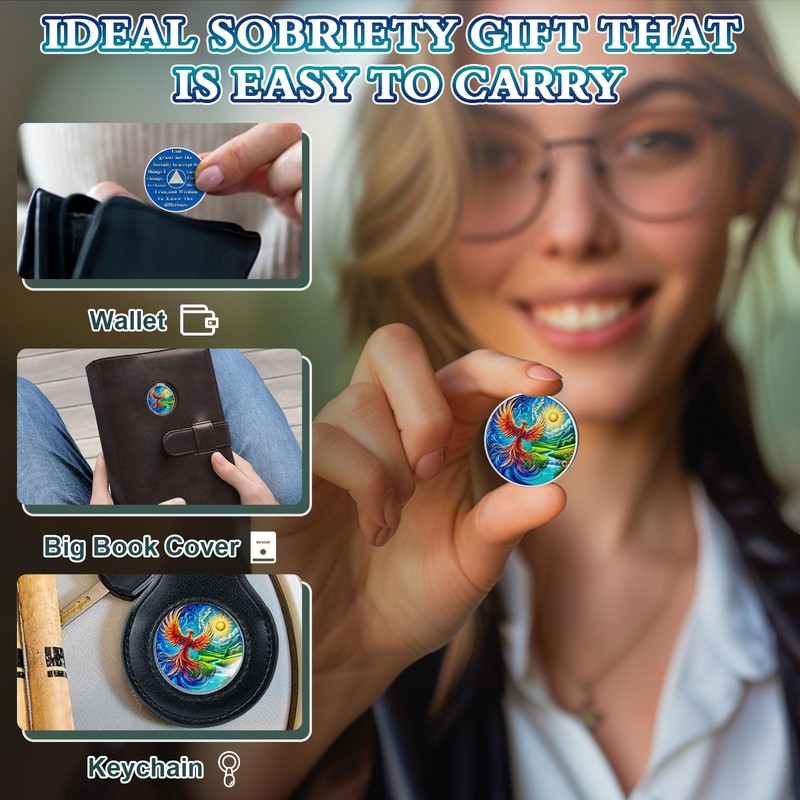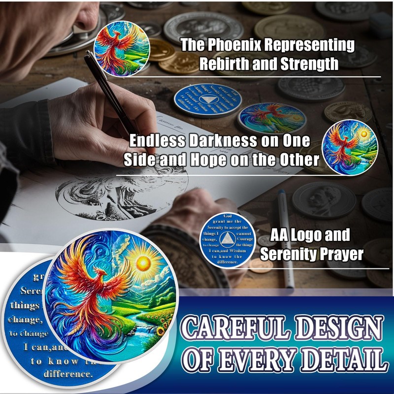 - From Darkness to Light: This Phoenix Sobriety Coin conveys the transformation from darkness to light. The phoenix symbolizing rebirth, the symbolic landscape and the famous Serenity Prayer together form a complete spiritual support system to help us gain courage and wisdom on our sobriety journey. This AA coin is not only a keepsake, but a daily spiritual support to help us maintain faith and strength in our sobriety journey