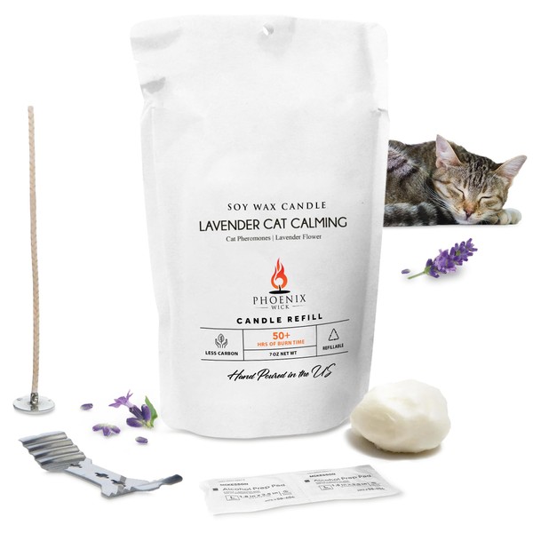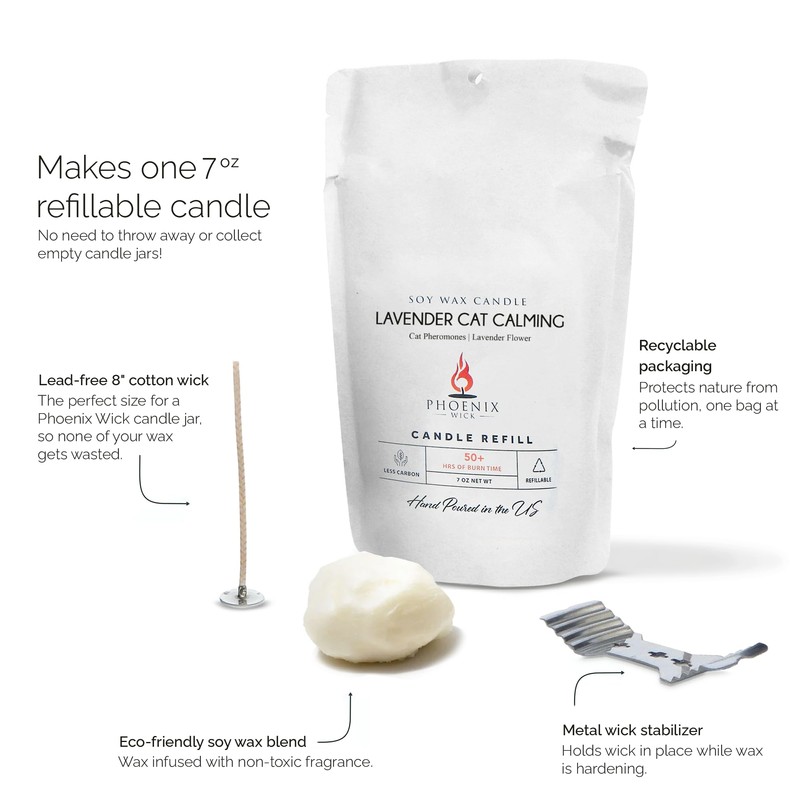Lavender Cat Calming Scented. Over 50 hours of burn time with clean toxin-free soy wax. A high quality candle from Phoenix Wick, a US based company bringing sustainability to the candle making industry. Candle lovers know the pain: Countless used candle jars accumulating around the house (or sadly, disposed of). What if there was a better way? There is! Phoenix Wick candles are reusable and refillable. Wax Refills provide pre-scented wax in the perfect portion size to completely refill your Phoenix Wick candle jar. Phoenix Wick is a fun and simple way to reduce waste, and make something that your family can enjoy! Other candle kits are a lot of work for busy people that don't have hours of craft making time to spare. They require you to measure out soy wax flakes, melt in a pot on a hot stove, mix in scented oils, and wipe up melted wax afterwards. Wax Refills from Phoenix Wick can be quickly melted in the microwave, and the pouch discarded or recycled after you are finished! Fun for adults, beginners, and kids with adult supervision. No mess, easy cleanup. Refill & remake a candle in 10 minutes or less.Included: 14 oz soy candle wax for candle making. 1 candle wick 1 candle wick holder