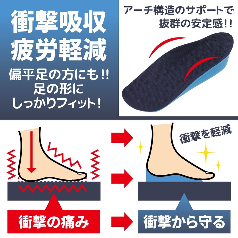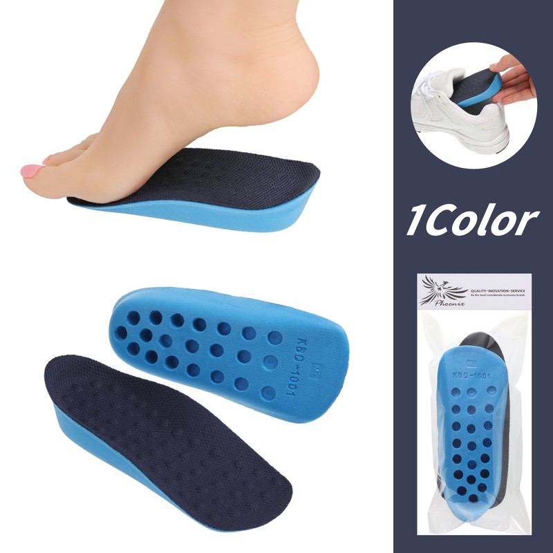 - Easy to use. Effect: Half insole reduces plantar fatigue. Fits securely in the heel and absorbs shock. Prevents flatfoot prevention. Excellent breathability and comfort; If you wear socks with the insole, they are tall even if you remove shoes. You won't even notice you're wearing it. Increases men's 1.6 inches (4 cm) and women's 1.5 inches (3.7 cm) for a woman, making the legs look longer. It also has a massage effect on uneven surfaces.