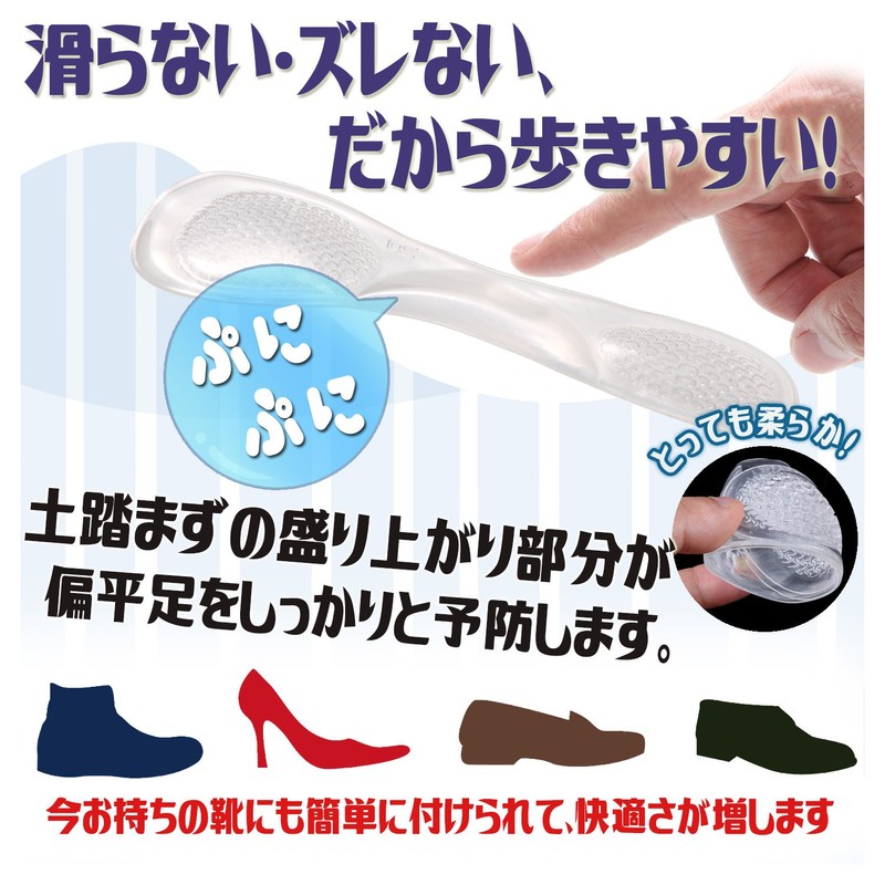 - Non-slip and non-slip, easy to walk. Easy! Just stick it to the insoles of your shoes. Even if you mess up applying it! It can be easily removed and reused over and over again. Non-slip and non-slip, easy to walk. The raised arch area prevents flat feet. Easy to put on your existing shoes for added comfort. Anti-Slip & Shock Absorbing Heel Prevents flatfoot caused by raised arch and anti-slip toe area and shock absorption
