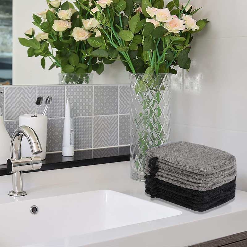 PHOGARY 10 Pack Microfiber Body Wash Mitts, Soft Face Mitten, Bath Spa Cloth, Reusable Makeup Remover Mitt Gloves, European Style Wash Cloth,6×8inch, Black and Grey
