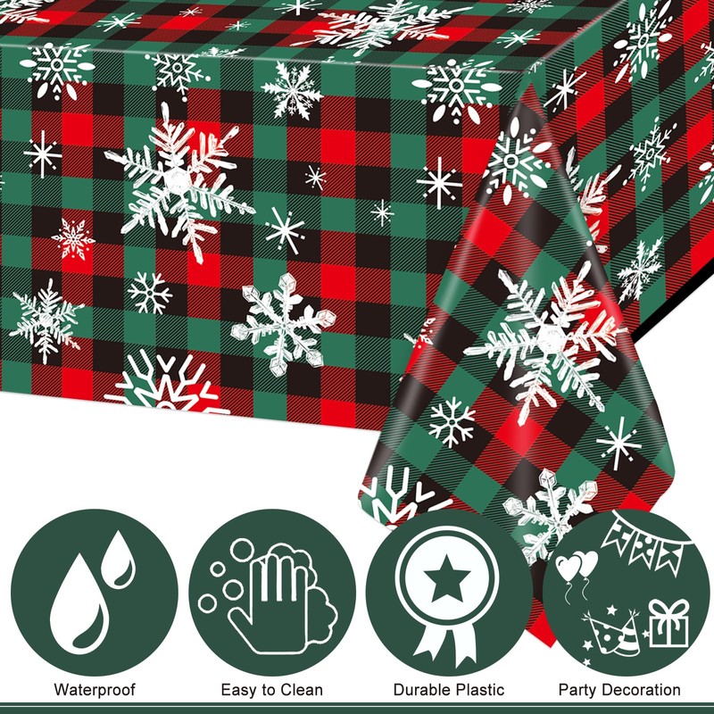 - Waterproof Disposable Plastic Christmas Plaid tablecloth: Lightweight, Portable, Spill-proof, and stain-resistant red and black checkered Christmas decorations snowflake tablecloth is the perfect addition to your winter, holiday and Christmas party decorations, whether adorning tables or serving as decorative backdrops or banners when hung on doors or walls
