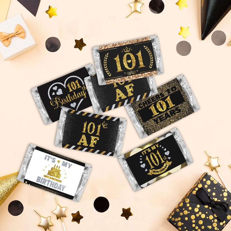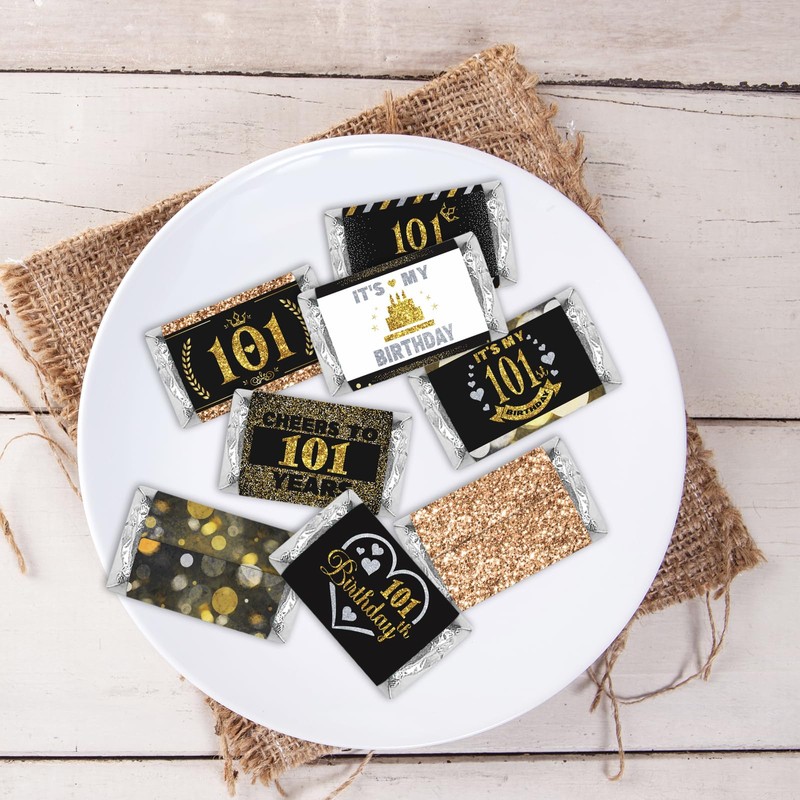 PHOHUI HAVE A NICE TIME Black and Gold 101st Birthday Party Mini Candy Bar Wrappers,Mini Candy Bar Wrappers Birthday Party Favors, Pack of 54. (101)
